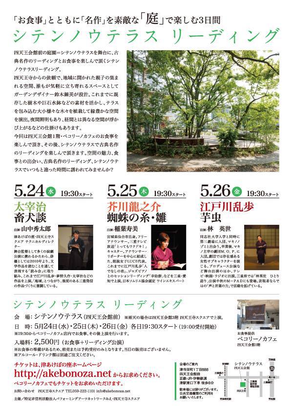 今回は四天王会館1階・ペコリーノカフェのお食事を楽しんで頂き、その後、シテンノウテラスで古典名作のリーディングを楽しんで頂きます。空間の魅力、食事との出会い、古典名作のリーディング、シテンノウテラスでいつもと違った時間に誘われてみませんか?
