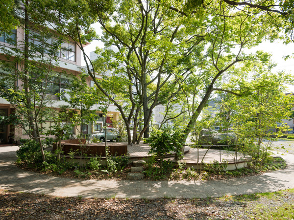 四天王寺からの依頼で、地域に開かれた親子の集まれる空間、誰もが気軽に立ち寄れるスペースとしてガーデンデザイナー鈴木錬美が設計。これまでに既存した樹木や巨石水鉢などの素材を活かし、テラスを包み込む大小様々な木々を植栽して緑豊かな空間を演出。夜間照明もあり、昼間とは異なる空間が浮かび上がるなどの仕掛けもあります。