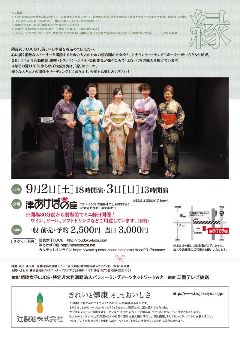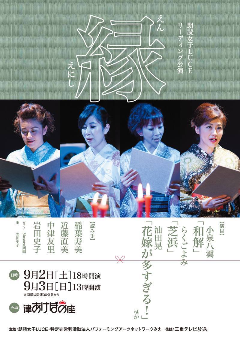 4年目の夏LUCE・津あけぼの座公演は、「縁」がテーマ。様々な人と人との関係をリーディングして参ります。今年もお楽しみください!