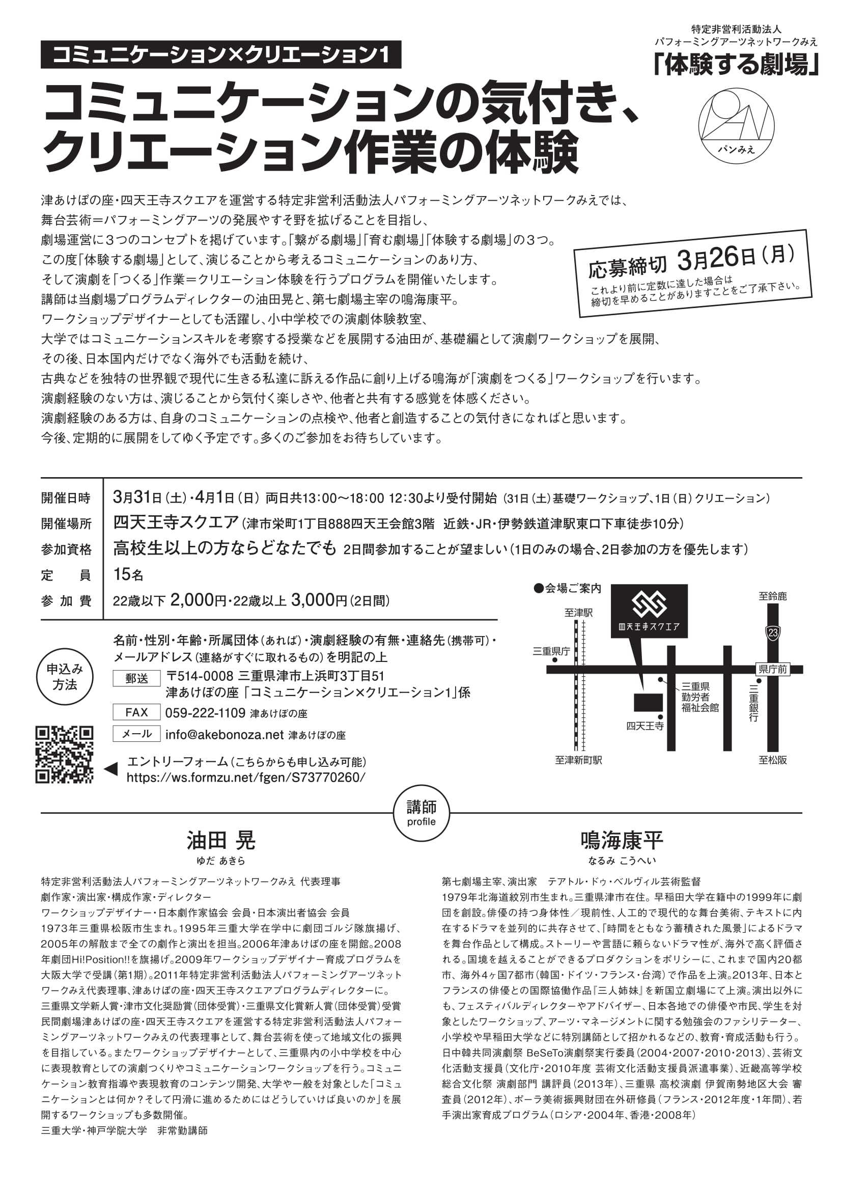 〒514-0008 三重県津市上浜町3丁目51 津あけぼの座「コミュニケーション×クリエーション1」係
