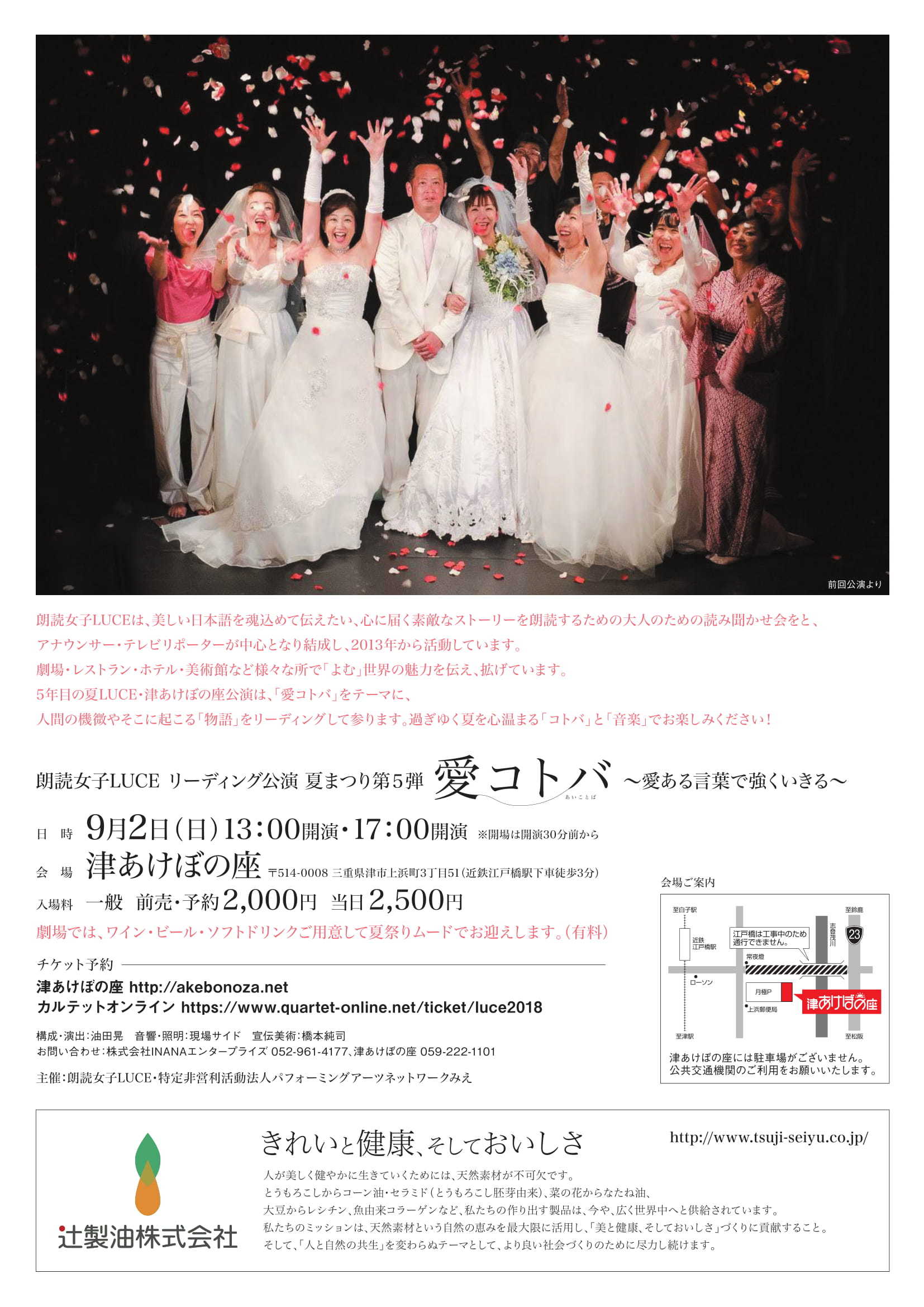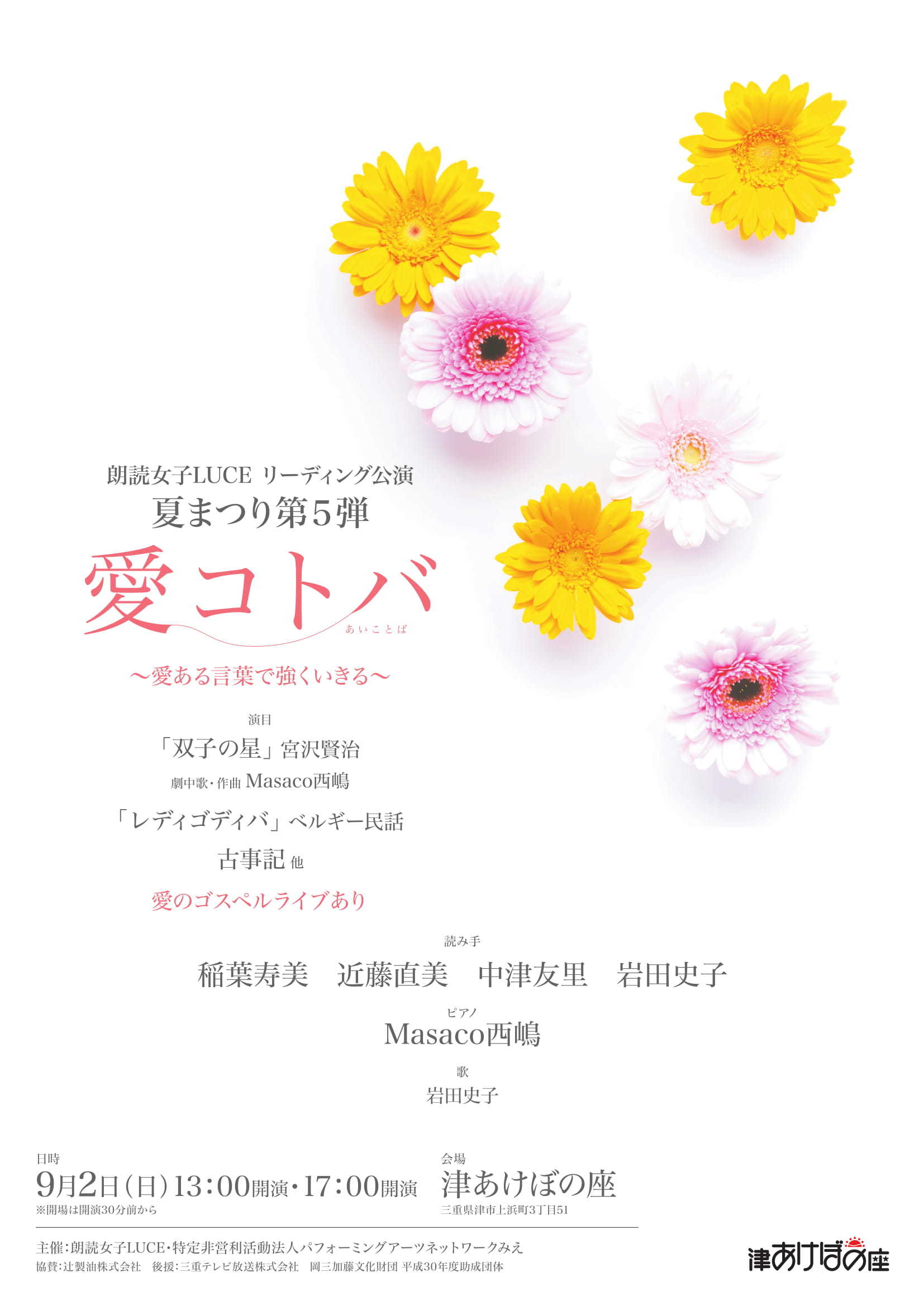 5年目の夏LUCE・津あけぼの座公演は、「愛コトバ」をテーマに、様々な人と人との出会い・物語をリーディングして参ります。今年もお楽しみください!
