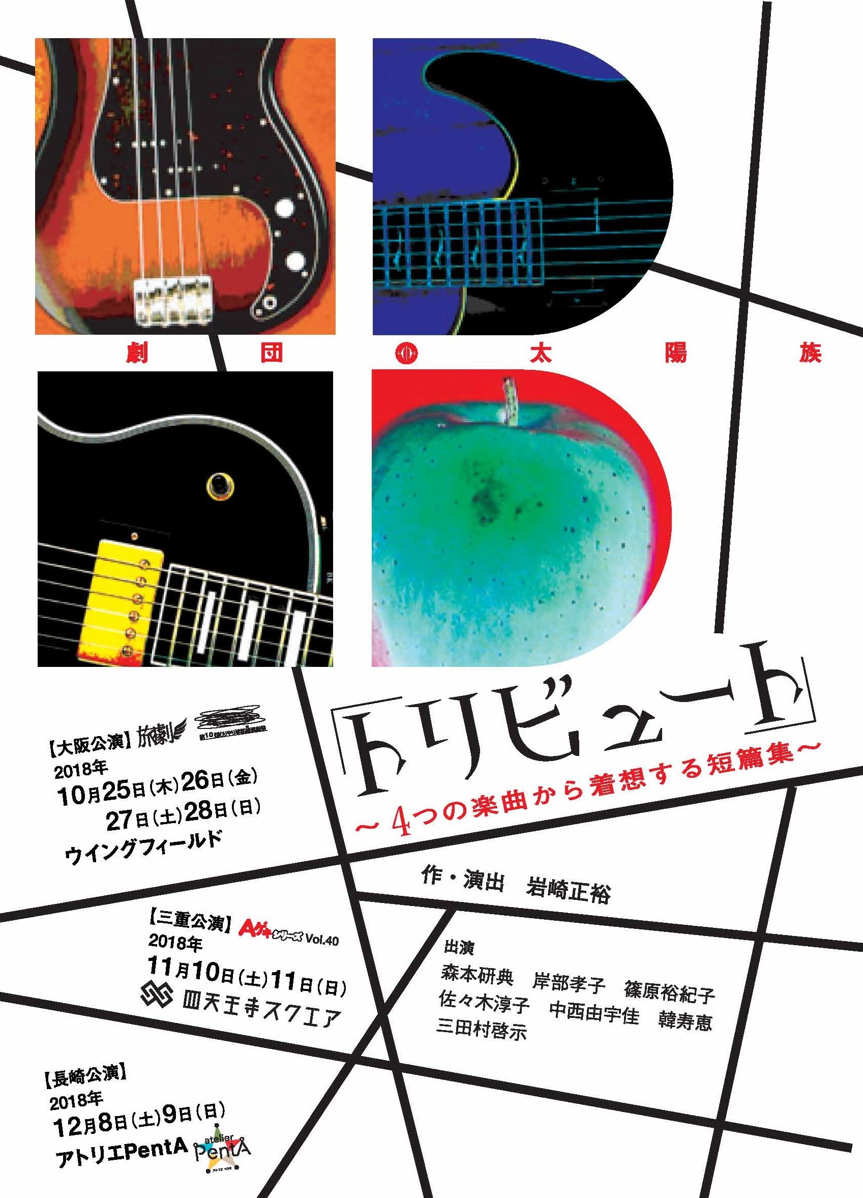 津あけぼの座が、全国のカンパニーからオススメしたい作品を招聘するAゲキシリーズ。AゲキシリーズVol.40は、ついに登場です。関西を拠点に社会で起きる事件や現象をモチーフに取りながら様々な作品の上演を続ける劇団太陽族。三重・鈴鹿市出身の劇団太陽族主宰・岩崎正裕さんは三重ともこれまでに様々な繋がりを持ち、ついにAゲキシリーズでの上演が決定しました。今回は4つの楽曲から着想された短篇を上演。その内の1作は2016年10月津あけぼの座開館10周年記念事業で上演されたゴルジ隊「つい。つい、うっかり」の中で、岩崎正裕さんの書き下ろしとなった「団地の三人姉妹」も上演されます。満を持しての四天王寺スクエア公演、お楽しみください!