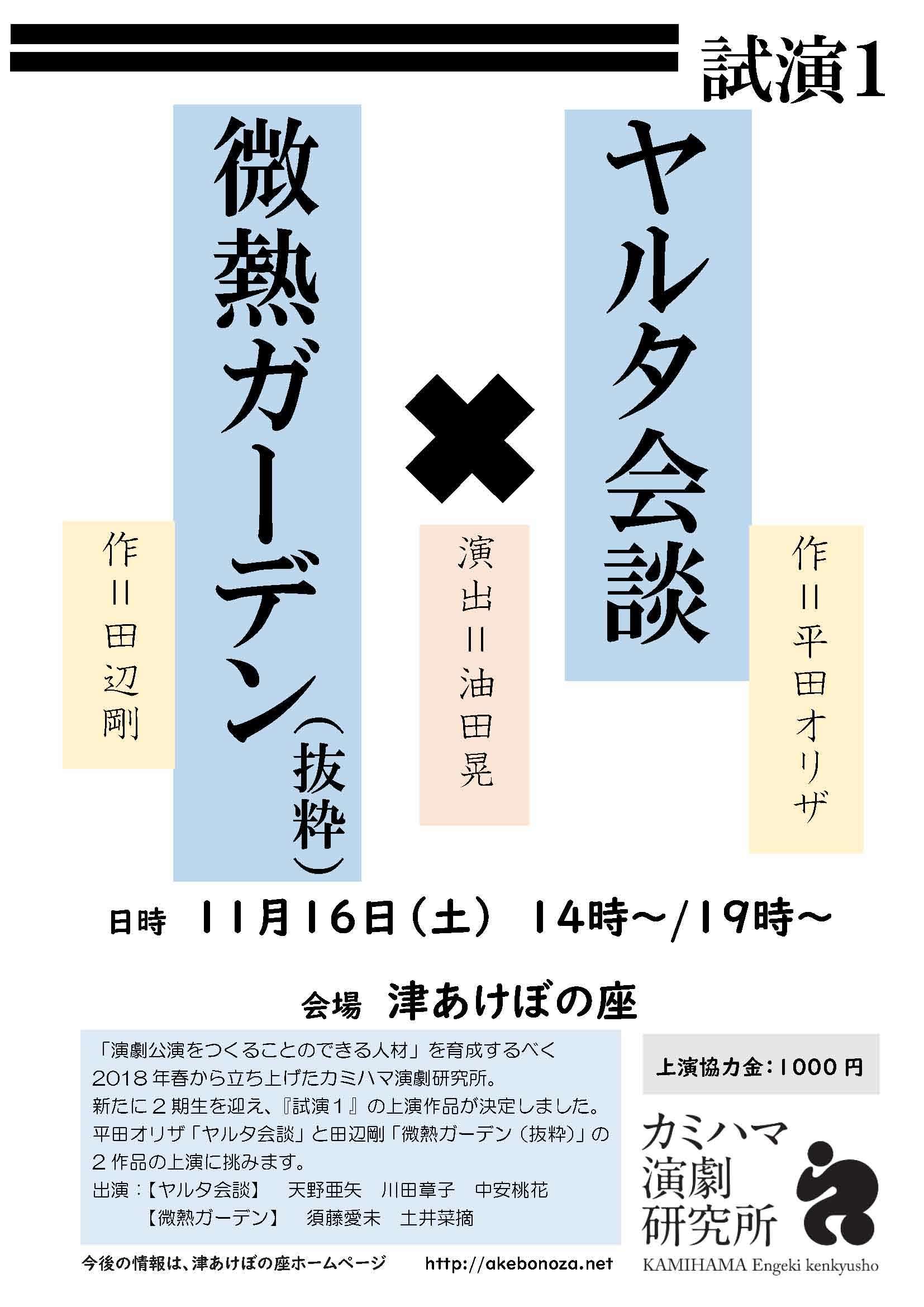演劇公演を製作・研究・上演するユニットとして今年春より活動を行っている「カミハマ演劇研究所」。「演劇公演をつくることのできる人材」を育成するべく研修が続いています。2019年5月より2期生も加わり、試演1に挑みます。今回は、平田オリザ「ヤルタ会談」、そして田辺剛「微熱ガーデン」の抜粋上演。
