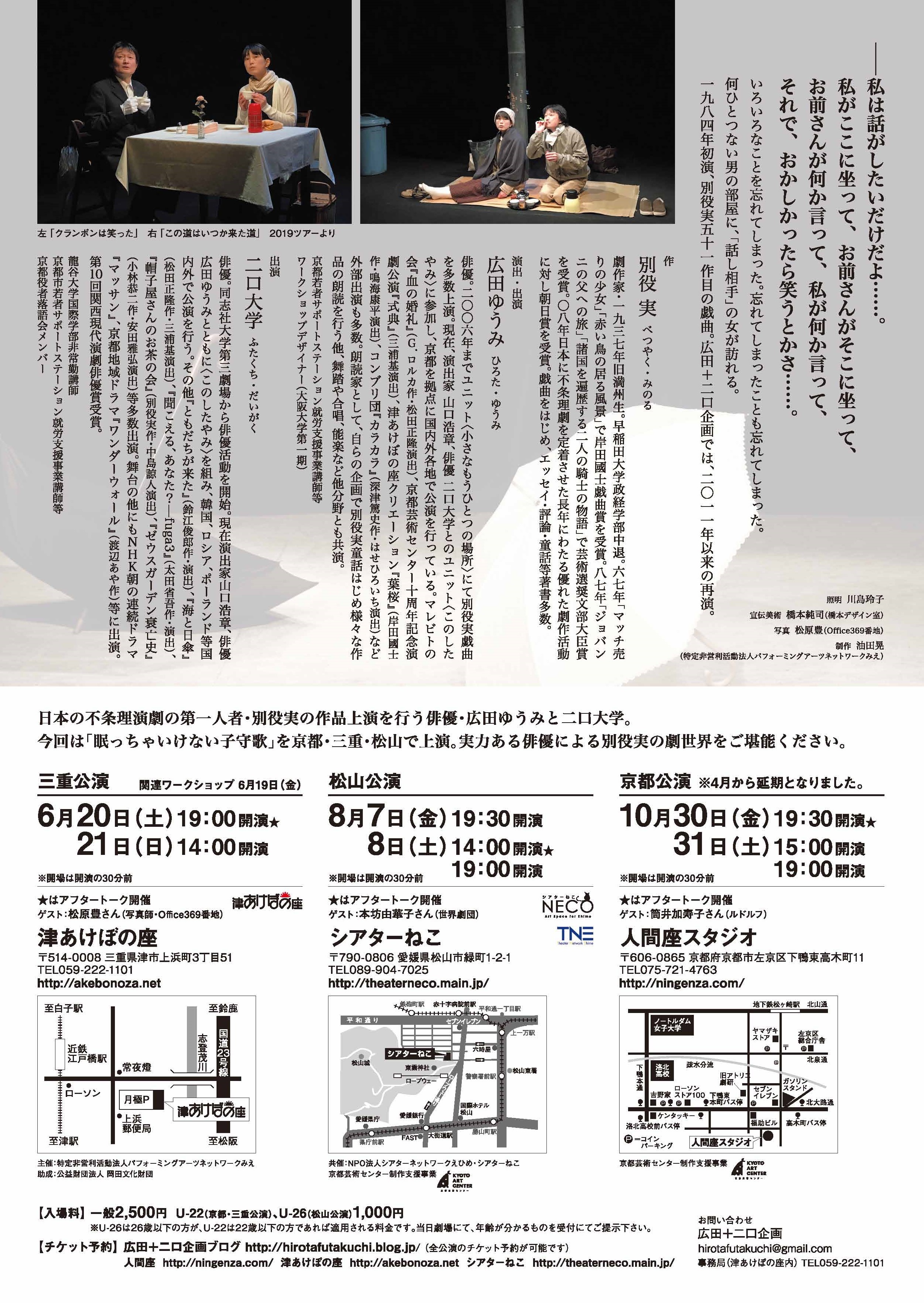 演劇ユニット「このしたやみ」の上演でお馴染みの俳優・広田ゆうみと二口大学による、日本の不条理演劇の第一人者・別役実の上演が2017年の「いかけしごむ」、2018年の「この道はいつか来た道」、2019年「クランボンは笑った」と上演し、2020年がいよいよ第4弾。