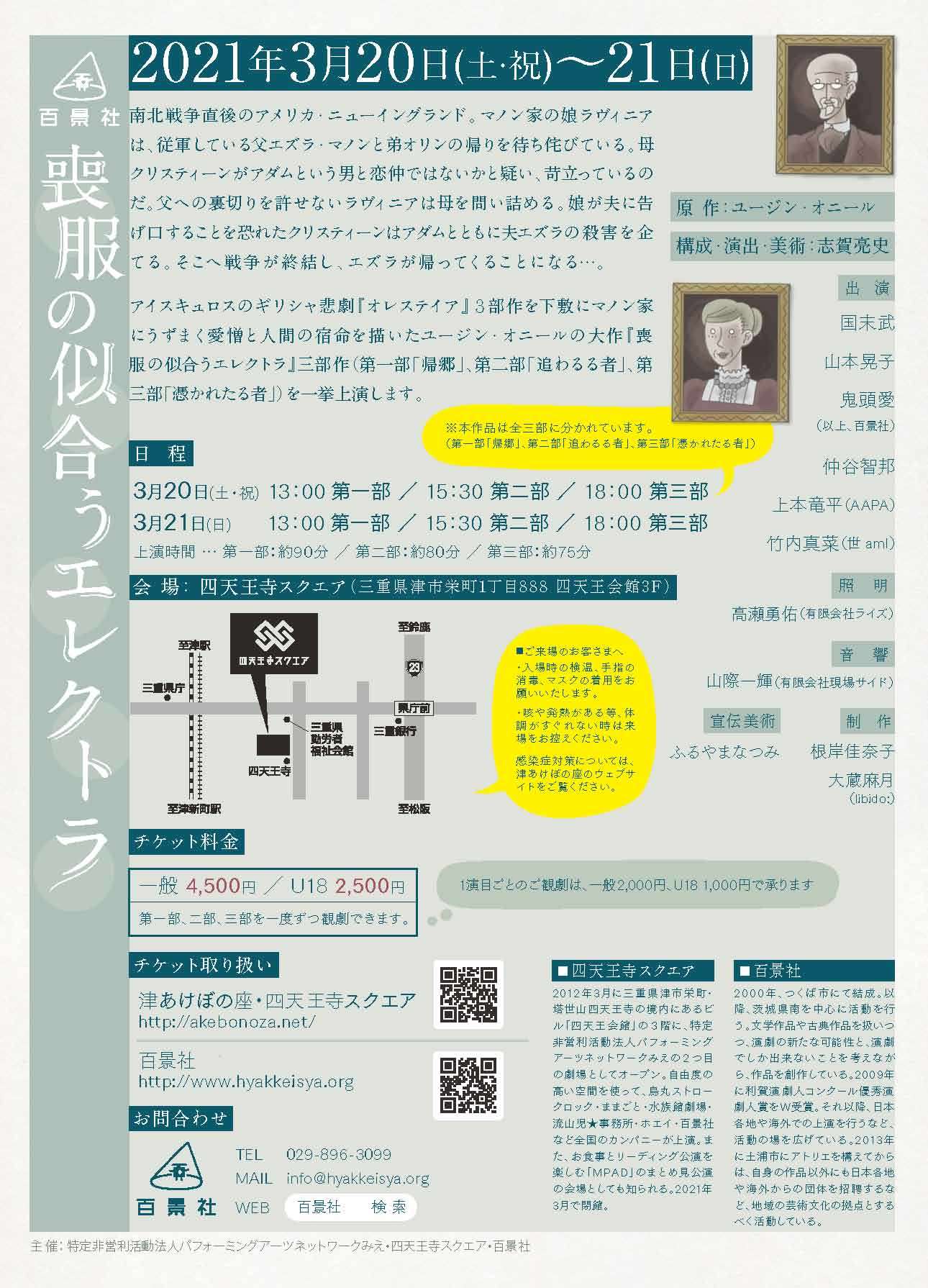 3月20日・21日に行われる四天王寺スクエア閉館公演・百景社「喪服の似合うエレクトラ」。アメリカの劇作家ユージン・オニールが、南北戦争直後、アメリカ・ニューイングランドのマノン家を舞台に家族間の激しい愛憎を描く物語は、、アイスキュロスのギリシャ悲劇『オレステイア』を下敷きに構成されています。