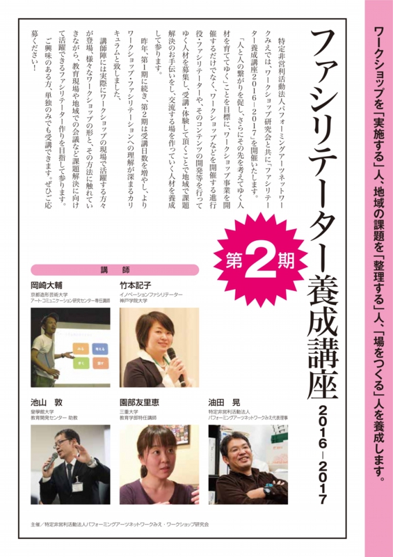 特定非営利活動法人パフォーミングアーツネットワークみえでは、ワークショップ研究会と共に「ファシリテーター養成講座2016-2017」を開催いたします。