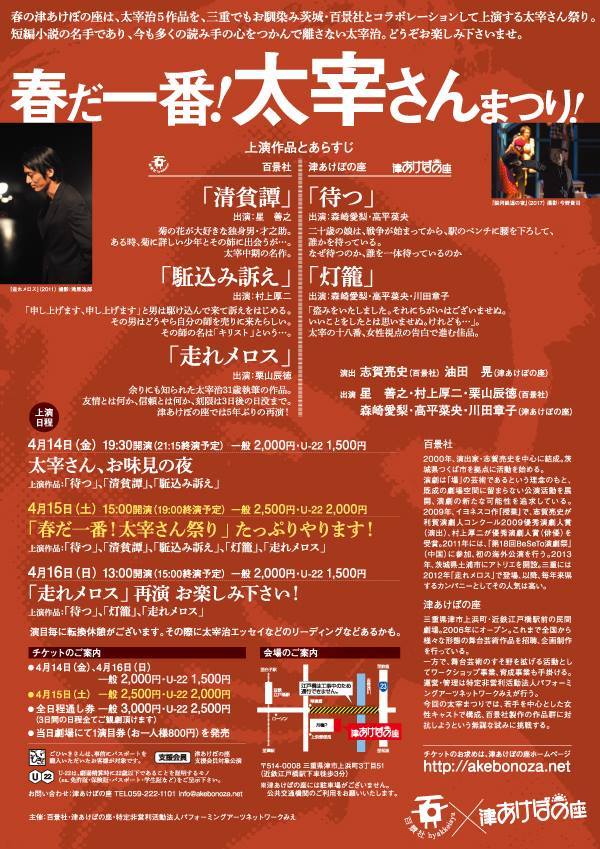 今回は、百景社版「走れメロス」5年ぶりの再演に加え、「駈込み訴え」「清貧譚」の3作を上演、一方で津あけぼの座はチームを編成して「待つ」「灯籠」を上演いたします。各日で上演目が違い、土曜日の4月15日は5作品の上演に加え、ロビーなどでもパフォーマンス・振る舞いなど予定しております。太宰さんまつり!、是非ご来場くださいませ!
