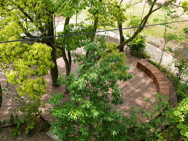 四天王寺からの依頼で、地域に開かれた親子の集まれる空間、誰もが気軽に立ち寄れるスペースとしてガーデンデザイナー鈴木錬美が設計。これまでに既存した樹木や巨石水鉢などの素材を活かし、テラスを包み込む大小様々な木々を植栽して緑豊かな空間を演出。夜間照明もあり、昼間とは異なる空間が浮かび上がるなどの仕掛けもあります。