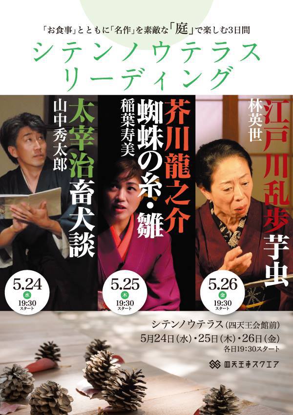 四天王会館前の庭園=シテンノウテラスを舞台に、古典名作のリーディングとお食事を楽しんで頂くシテンノウテラスリーディング。