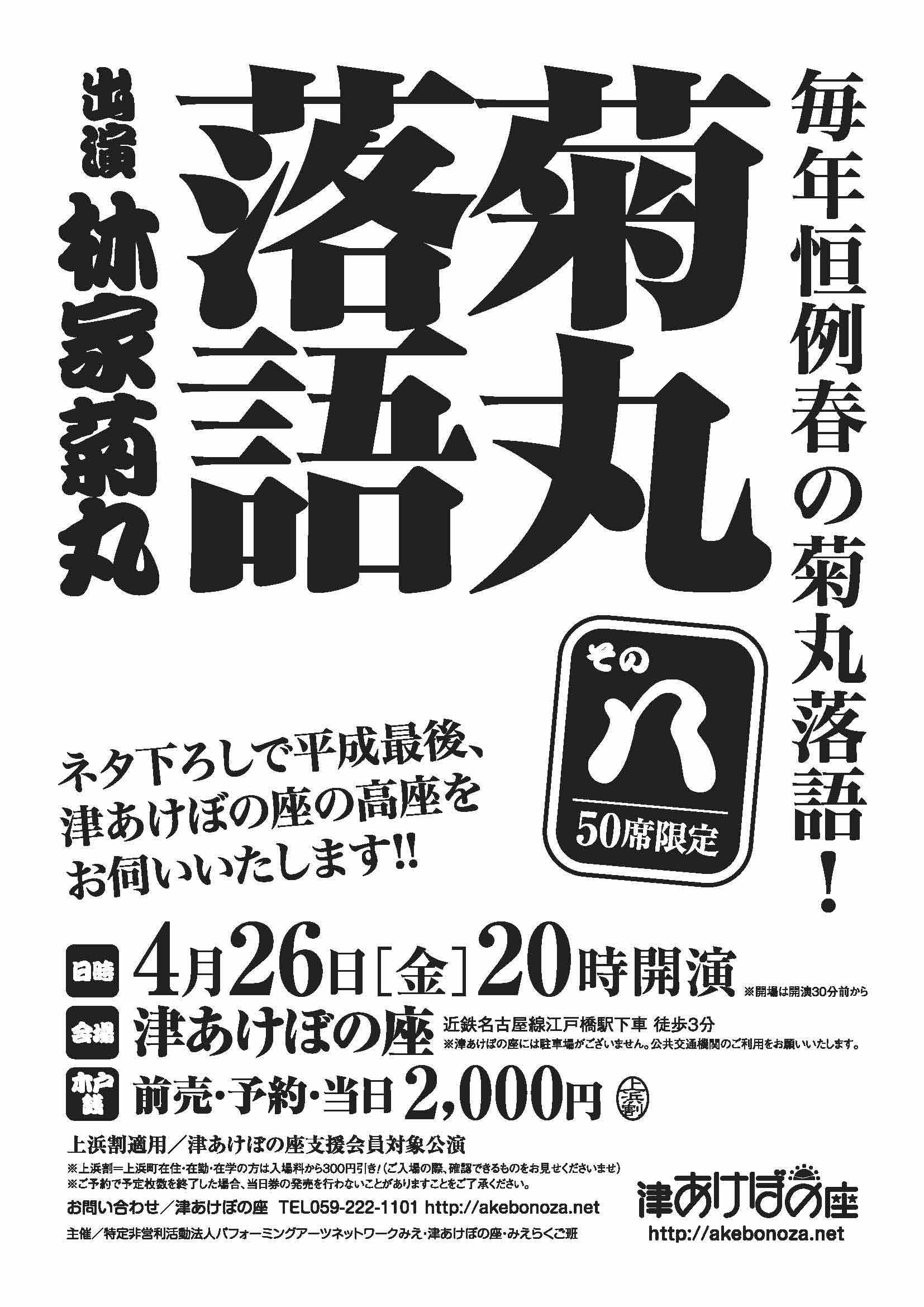 平成最後の津あけぼの座事業は、菊丸落語!