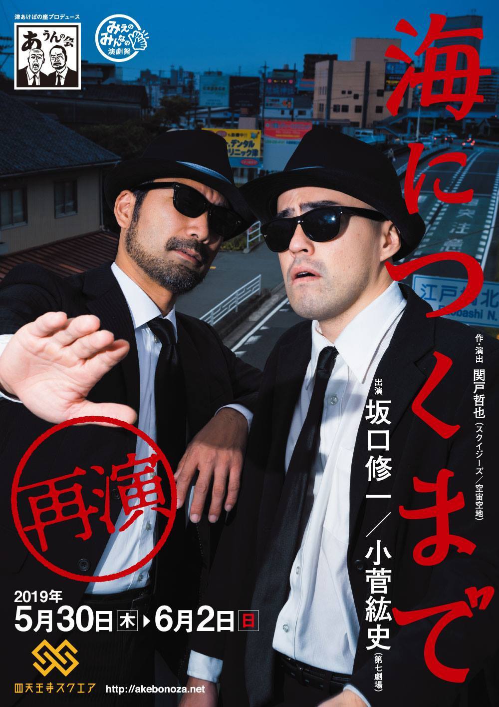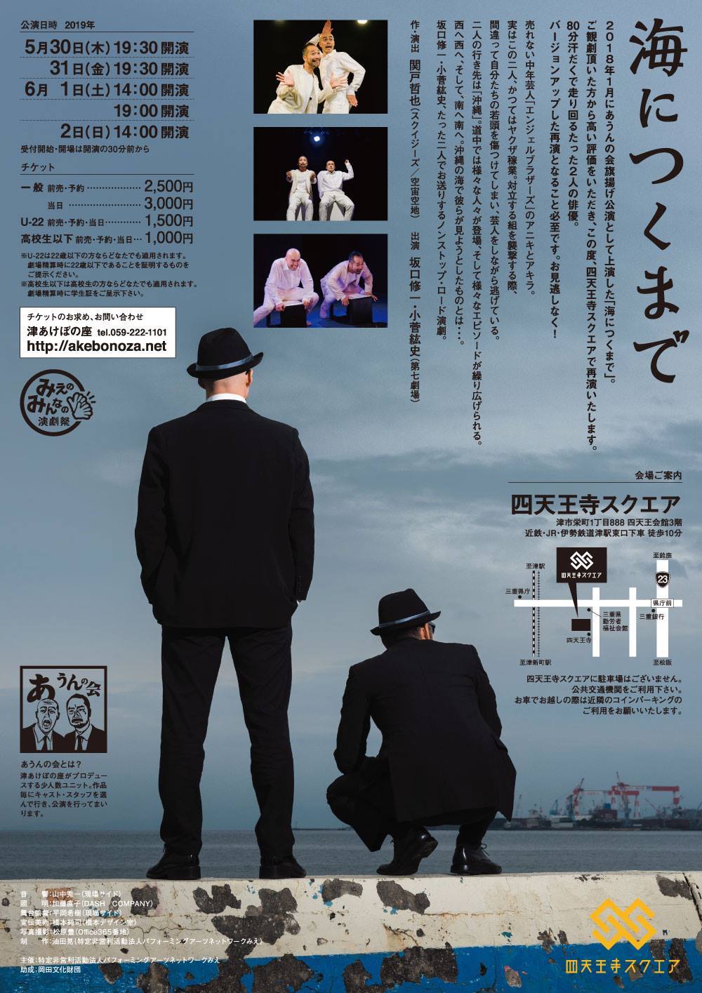 津あけぼの座がプロデュースする少人数ユニット「あうんの会」の旗揚げ公演として2018年1月に上演した「海につくまで」。80分間、2人の俳優が様々な役を演じ分けながら舞台を汗だくで走り回る「ノンストップロード演劇」と名付けたこの作品は高い評価を頂戴しました。今回、平成を越えて、令和にいよいよ再演。会場は津あけぼの座から四天王寺スクエアと舞台がさらに広くなり、再演と言えども様々な所をバージョンアップ。前回見て頂いた方にも、今回初めてご覧になる方にも楽しんで頂ける作品となっております。脚本・演出は、空宙空地で活躍を続ける関戸哲也。今年1月に「ラウンド・アバウト・ミッドナイト」でも好評だった坂口修一・小菅紘史の2人の俳優が、再びノンストップで上演いたします。今回もお楽しみください!!