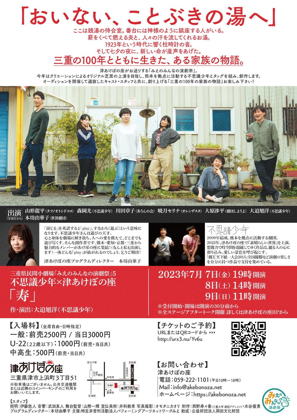 津あけぼの座がお送りする「みえのみんなの演劇祭」。今年はクリエーションによるオリジナル芝居の上演を目指し、熊本を拠点に活動する不思議少年とタッグを組み、創作。