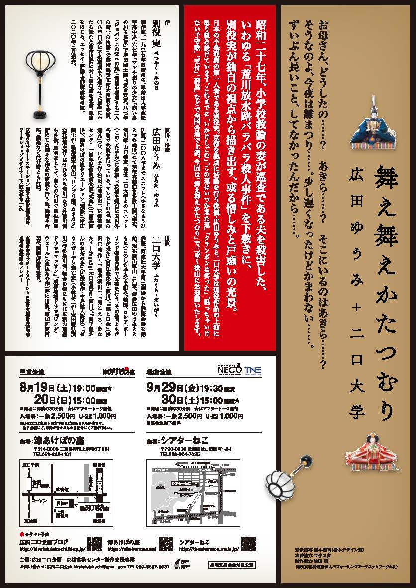 広田+二口企画は2010年に結成、広田が演出、二口・広田が出演し、別役実作品の上演や、文藝作品の朗読にに取り組む。