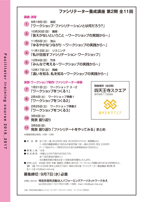 特定非営利活動法人パフォーミングアーツネットワークみえでは、ワークショップ研究会と共に「ファシリテーター養成講座2016-2017」を開催いたします。