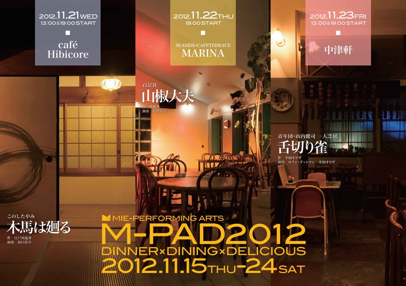 M-PAD2012は津のまちの6つの飲食店・寺院で6劇団が登場、9公演を開催いたします